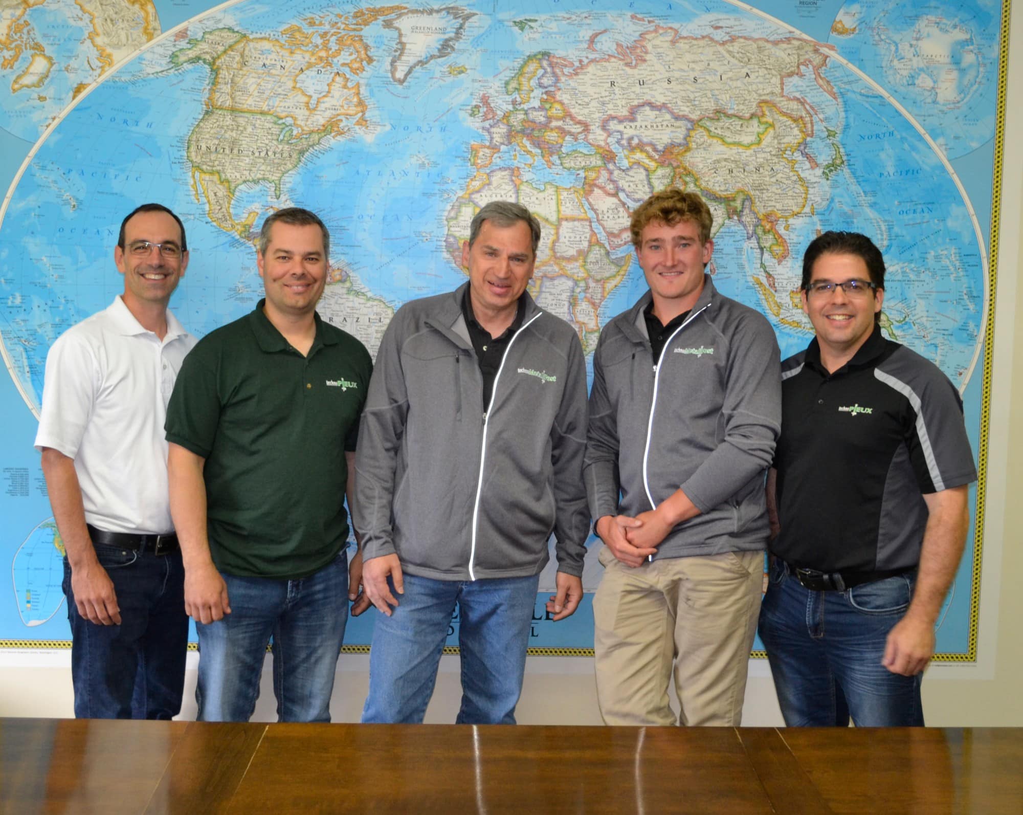 De gauche à droite : Serge Larouche (directeur développement USA), Étienne St-Laurent (directeur général), Tony Verga (Propriétaire de Techno Metal Post Illiana), Zachary LaPorte (propriétaire de Techno Metal Post Vermont) et Pascal Marceau (président)