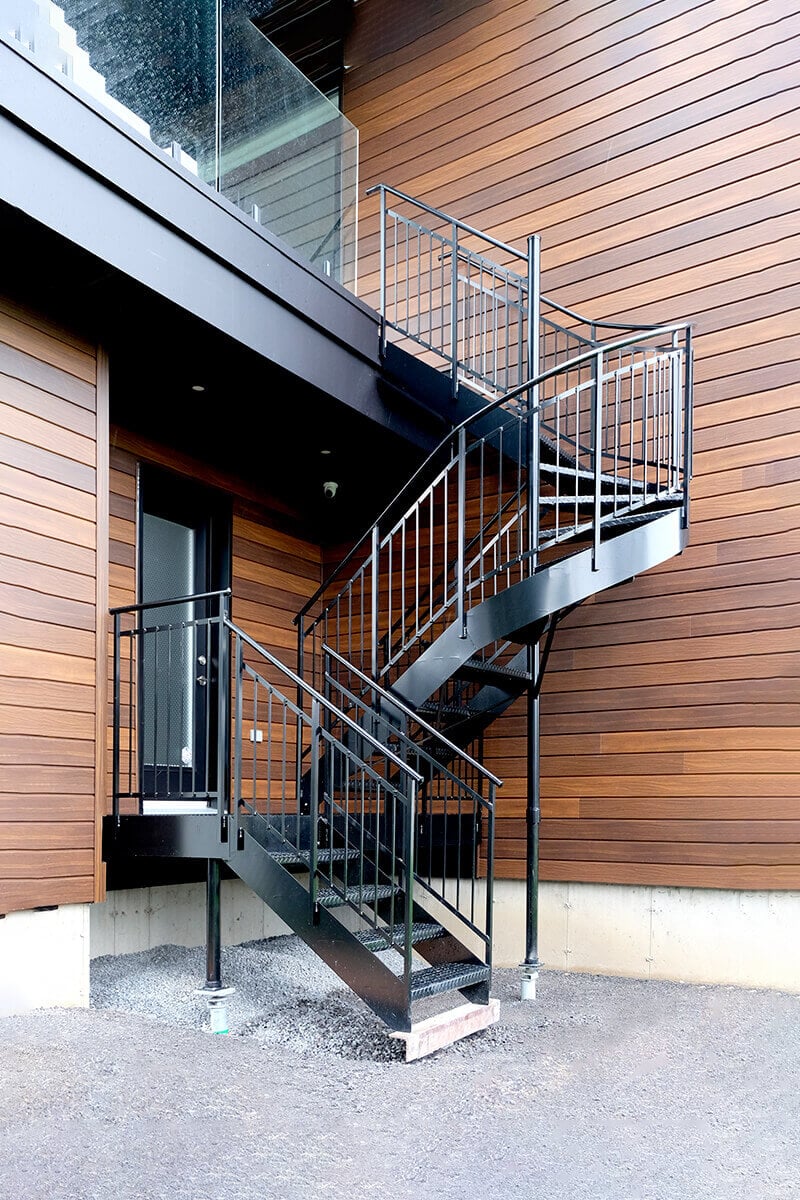 Afin d'assurer la stabilité d'un escalier, que l'ossature soit en bois ou en acier, le choix d'une fondation durable est primordial. De plus, l’utilisation de pieux vissés remédie à la problématique d’installation des fondations sur un terrain en pente. Cette solution permet d’offrir une économie drastique sur les coûts et délais d’opération.
