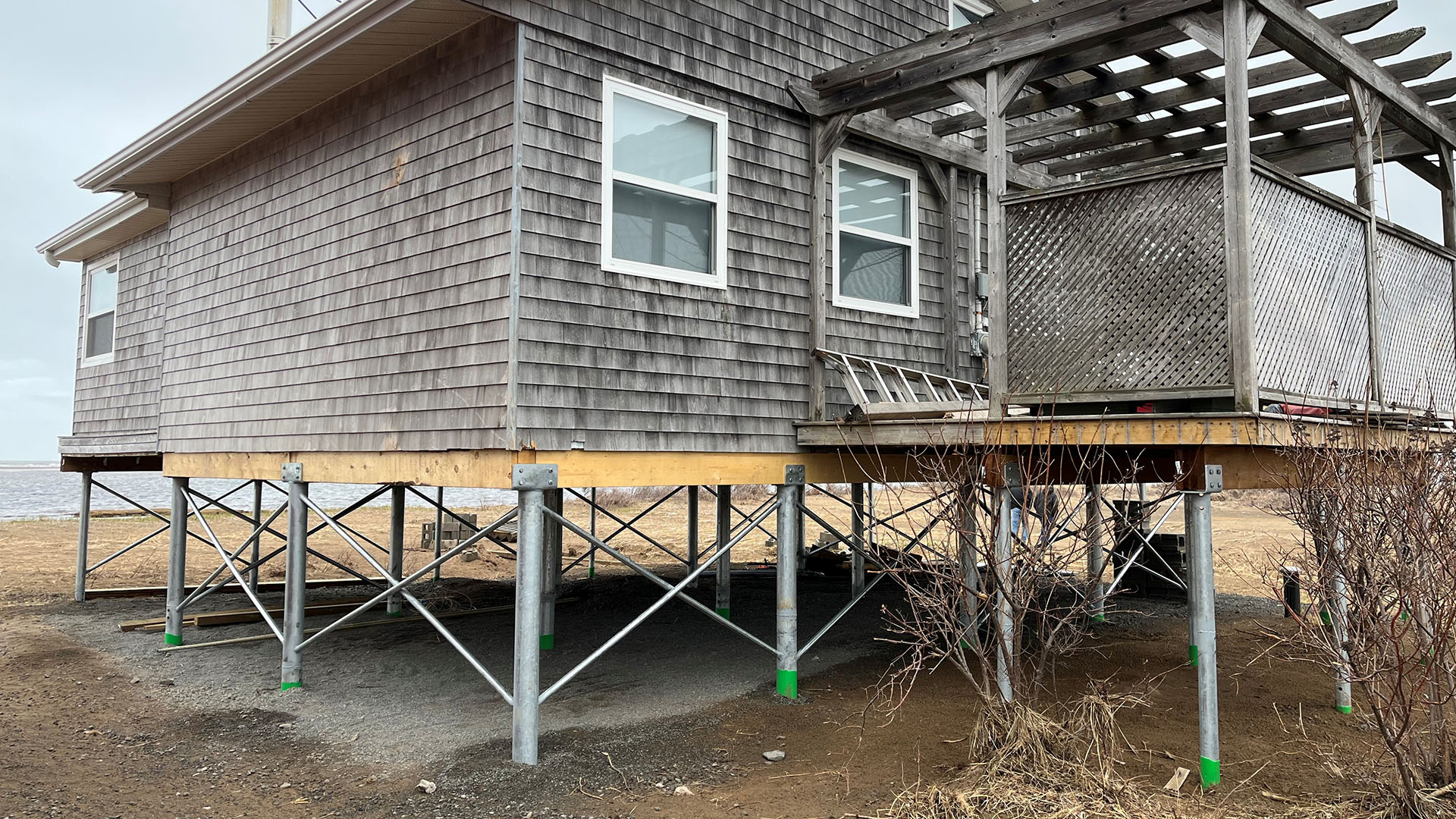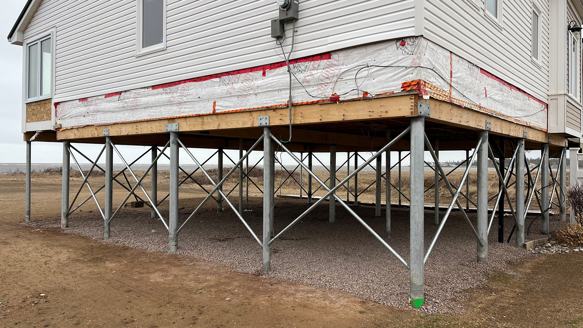 Lorsqu’un bâtiment est surélevé, comme les chalets ou les maisons dans les zones à niveau phréatique élevé ou dans un environnement particulier, l’ajout d’un système de contreventement (barres métalliques qui relient les pieux) est nécessaire pour plus de stabilité et pour renforcer la stabilité des pieux vissés.