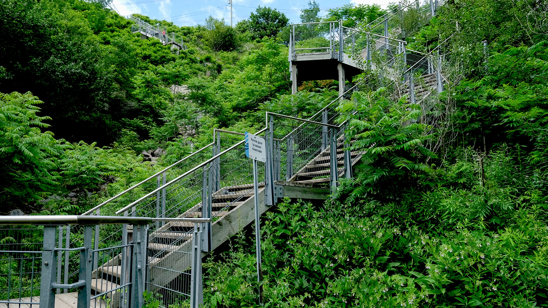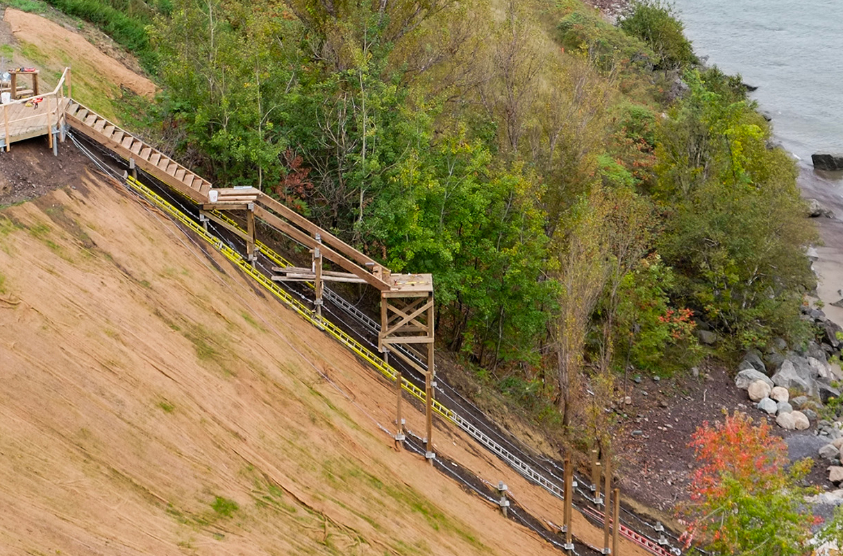 La Ville de Québec souhaitait créer une liaison entre la grève du fleuve Saint-Laurent, notamment la promenade Samuel-de-Champlain, et le sommet de la côte situé près des ponts, parachevant ainsi le Sentier des Grèves. Ce parcours piétonnier de 1,7 km longe majestueusement le fleuve entre le parc de la Plage-Jacques-Cartier et le pont Pierre-Laporte. Il offre un accès privilégié à la plage Gagnon tout en dévoilant des panoramas exceptionnels sur le fleuve et les infrastructures environnantes.