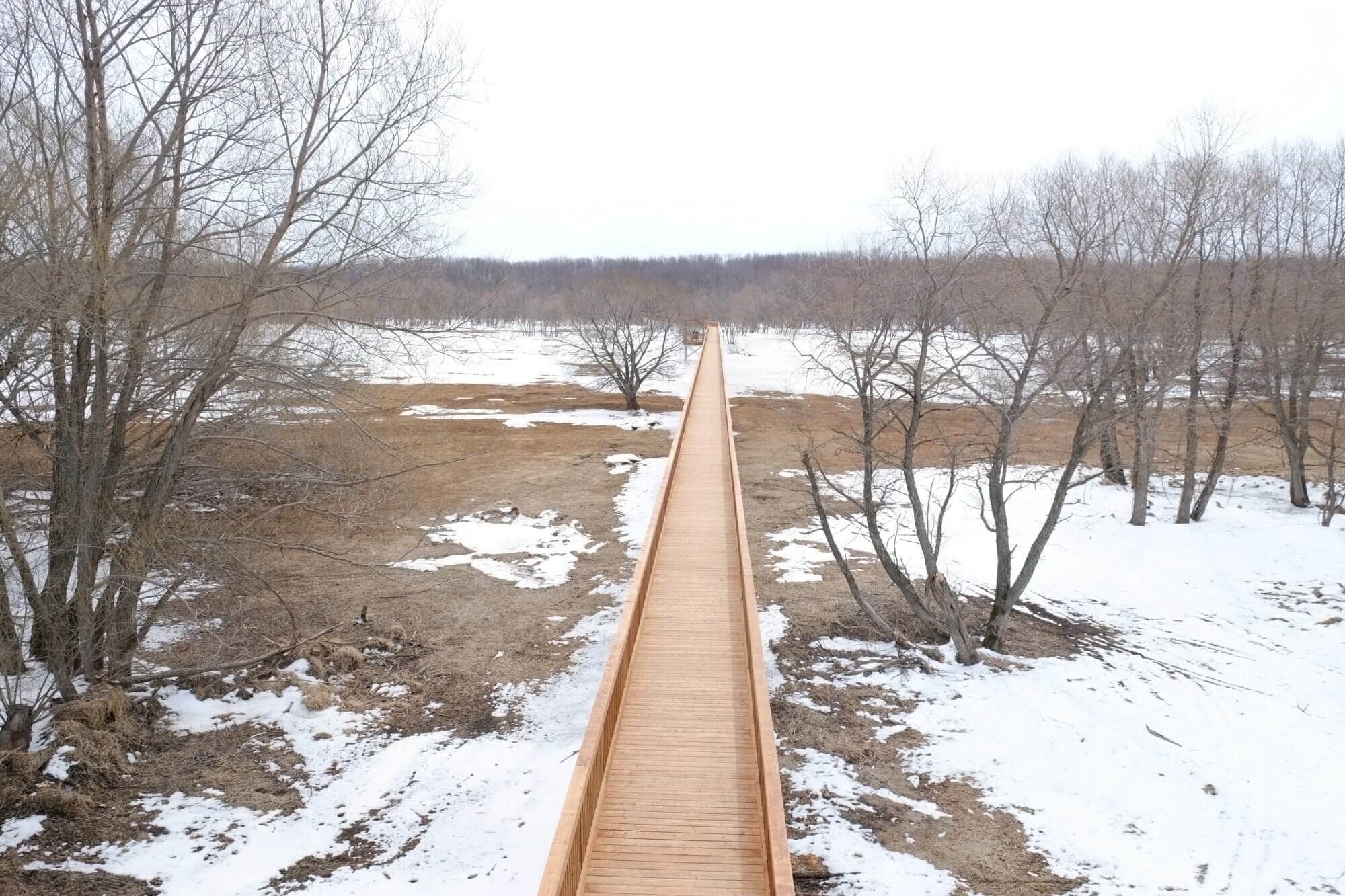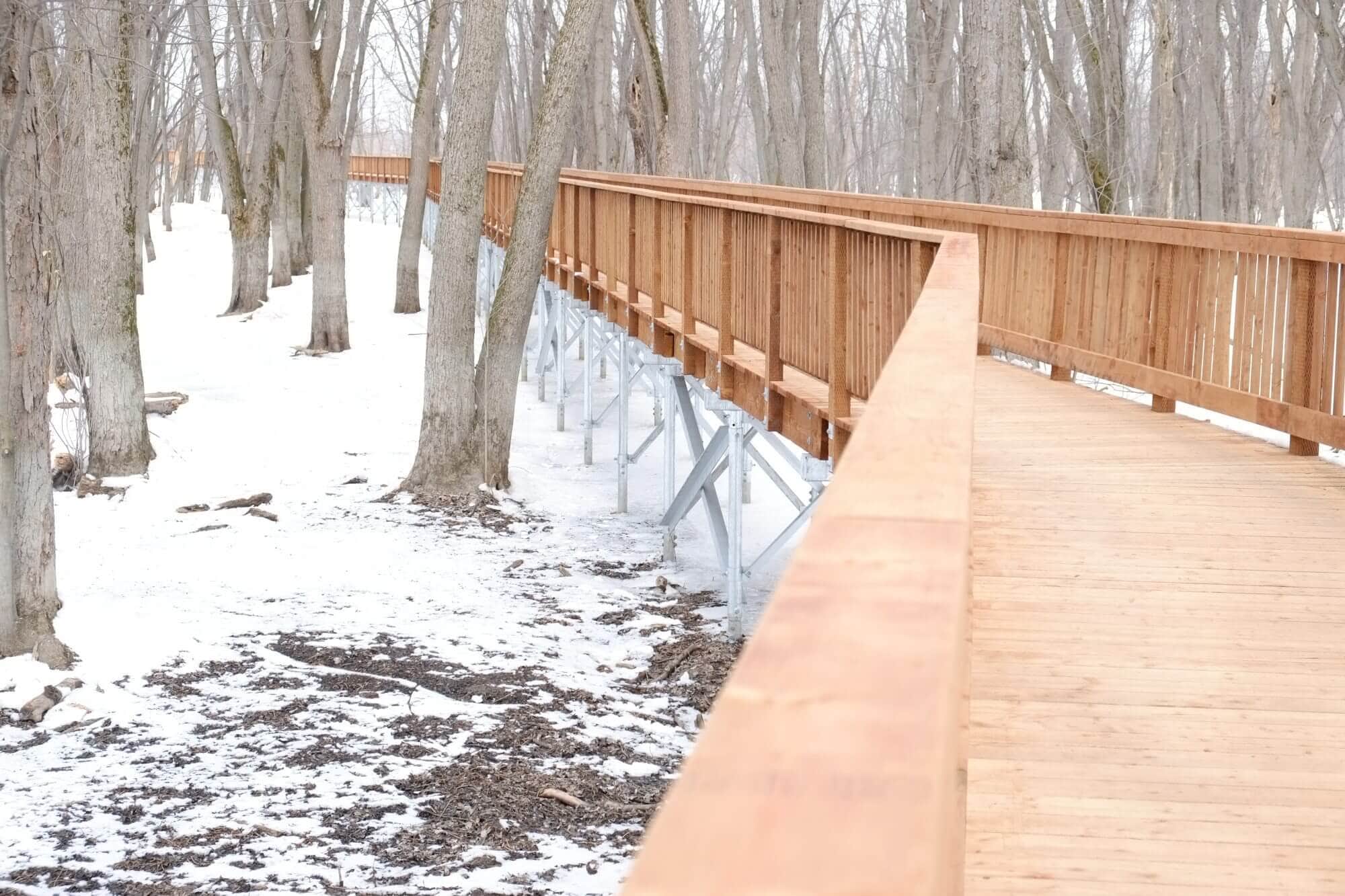 La passerelle du Parc écomaritime de l'Anse du Port à Nicolet, Qc, Canada est maintenant ouverte. Cette passerelle surélevée en bois, qui fait 1 km de long et qui culmine par un observatoire de 12 m de haut, a été complètement reconstruite. Elle traverse une érablière argentée et un marais où vit une faune très variée.