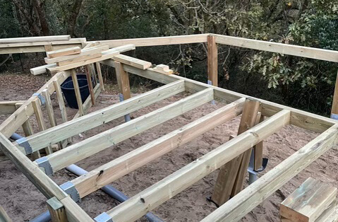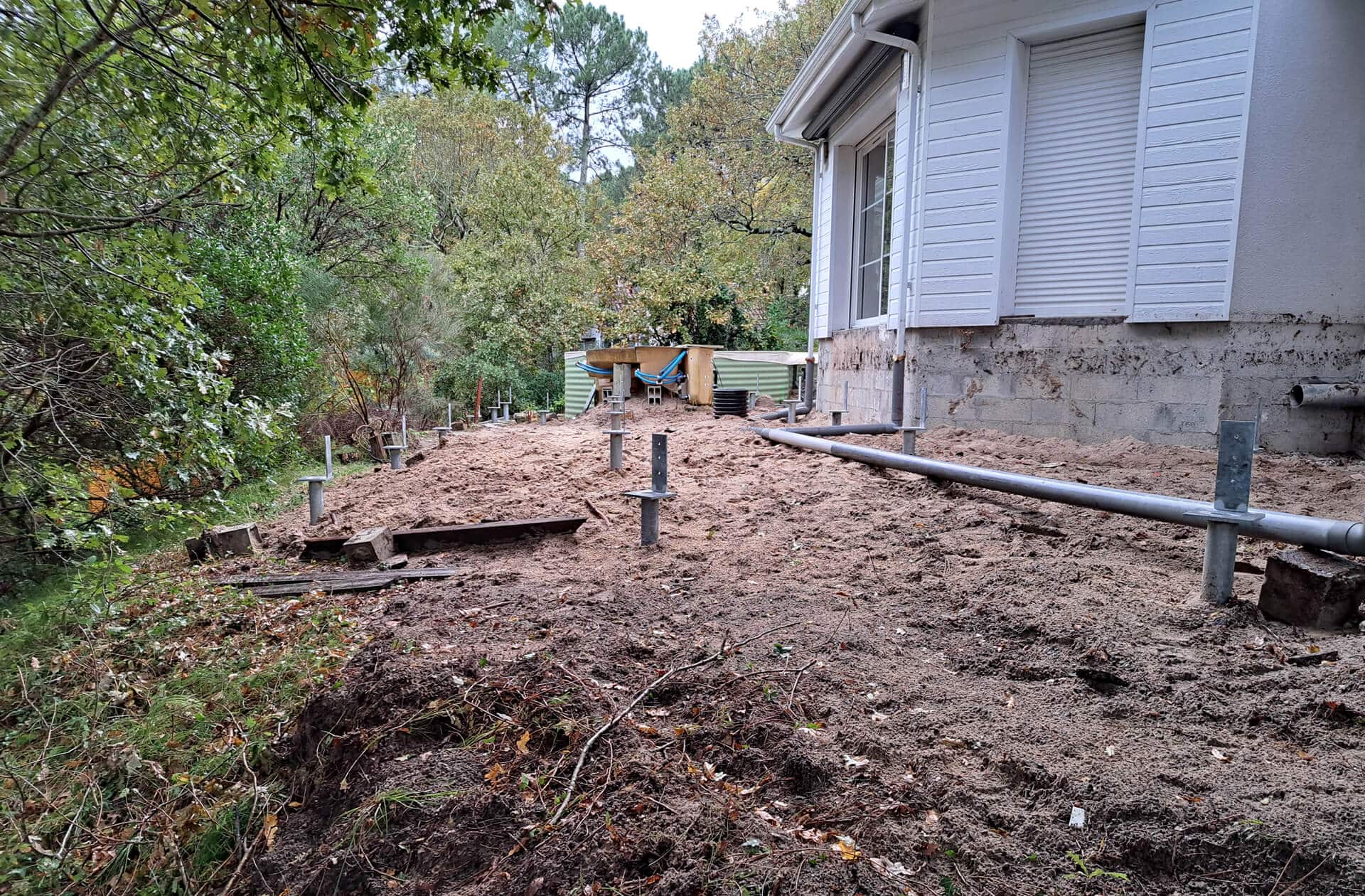 Ce projet de construction s’inscrit dans le cadre d’une réhabilitation d’une terrasse en bois exotique avec piscine à l’arrière d’une villa à Biscarrosse Lac. En effet, Techno Pieux Landes est intervenu à la suite d’un sinistre constaté par l’assurance. Les fondations en plots béton précédemment installées n’étaient pas conformes, car elles s’affaissaient et engendraient des mouvements sur la terrasse. Les fondations par pieux vissés métalliques Techno Pieux ont été sélectionnées pour soutenir la terrasse bois rénovée.