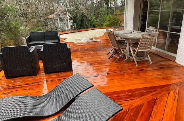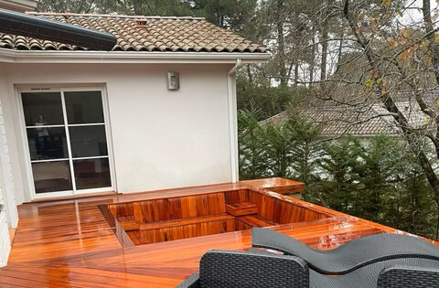 La terrasse est en bois exotique, sur poteaux bois supporté par des platines 20x20 cm.