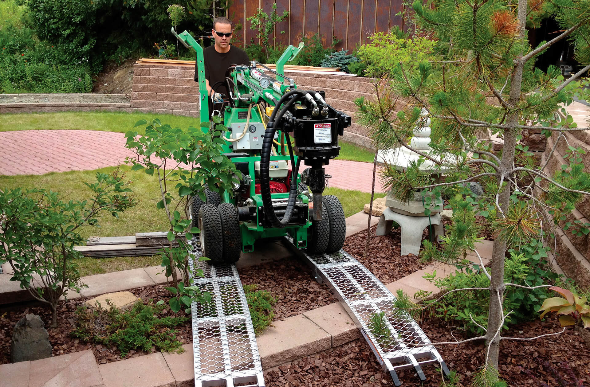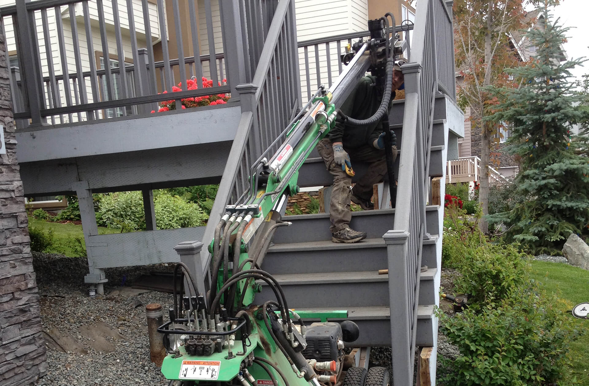 Notre équipement permet d’installer des pieux sous la majorité des patios standards, dans des espaces aussi bas que 36 pouces du sol. Aucune nécessité de défaire votre patio pour effectuer des travaux de fondation précis!