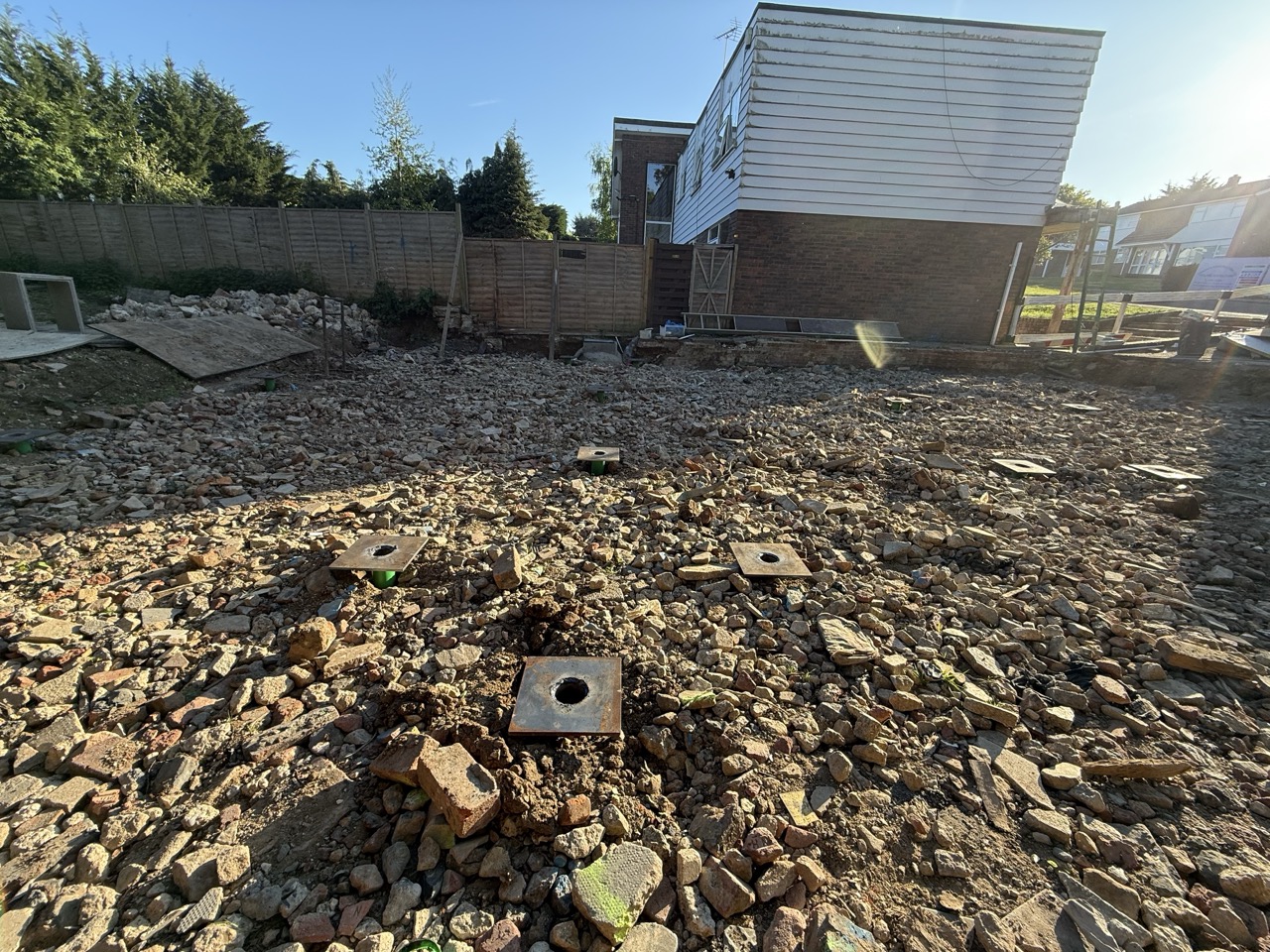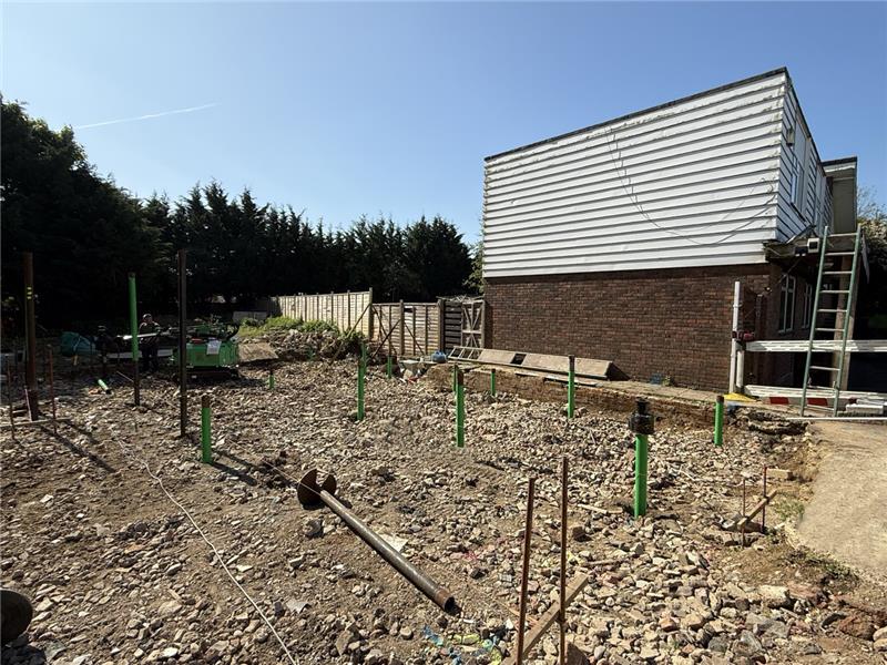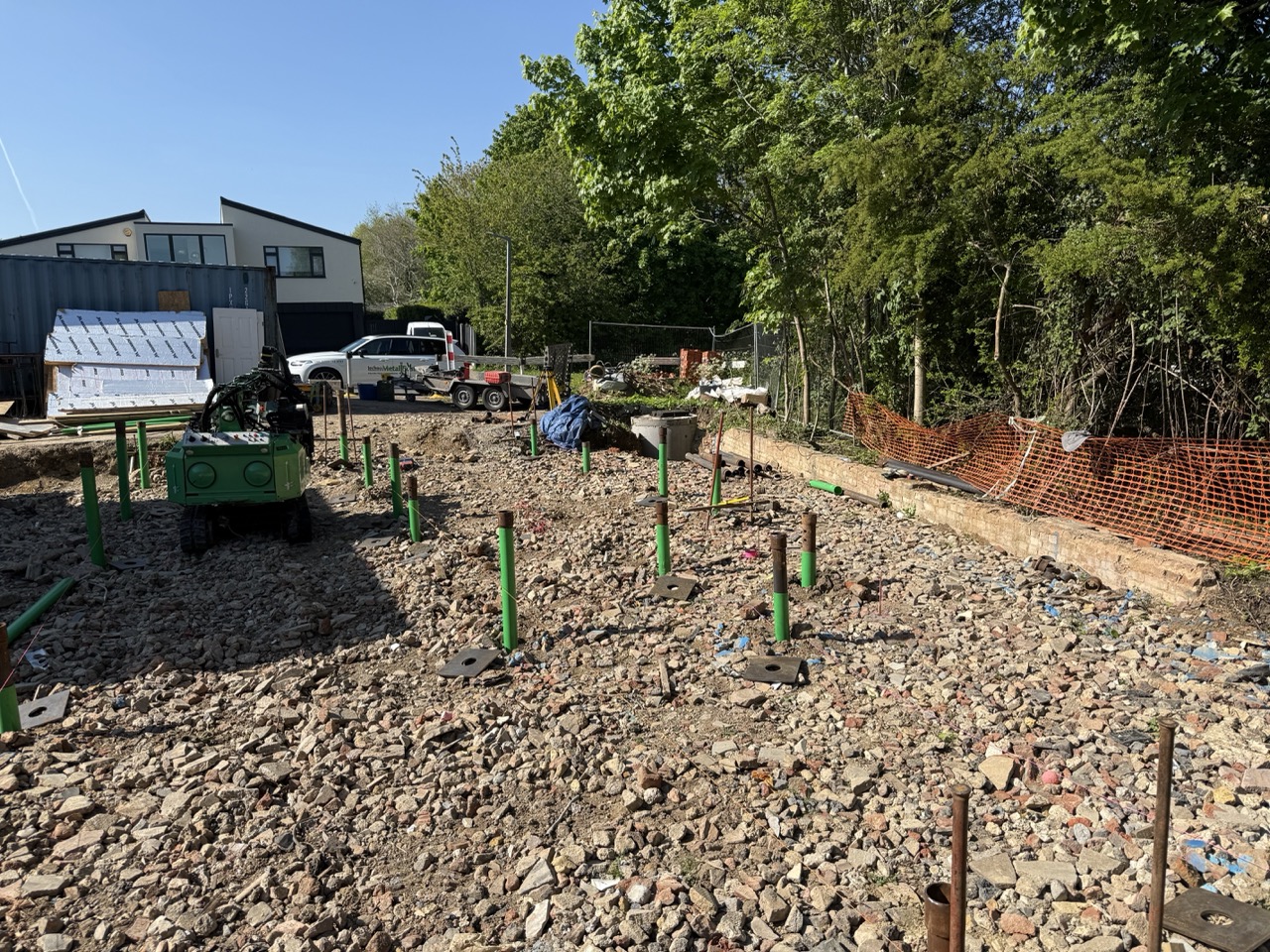Le terrain présentait une contrainte importante : la présence de gravats en surface compliquait l’installation des fondations. Il était essentiel de garantir une implantation millimétrée dans le positionnement des pieux vissés pour assurer la stabilité à long terme de la structure, dans des conditions de sol spécifique.