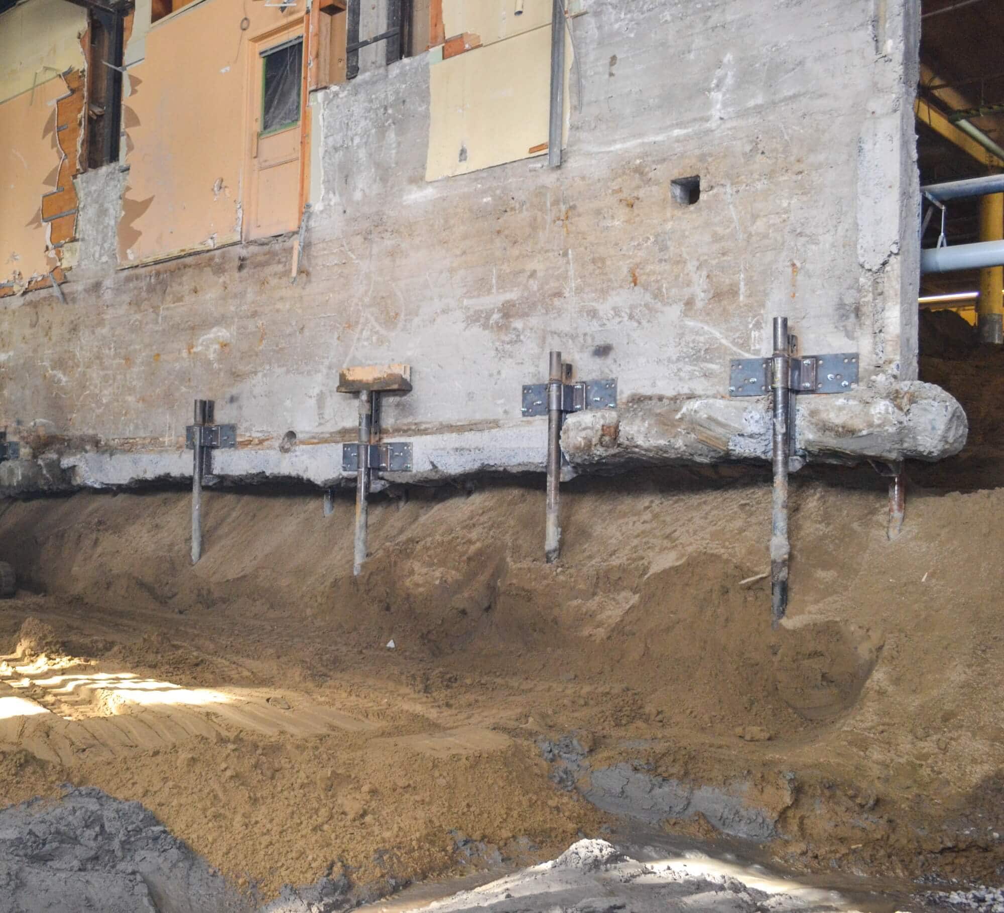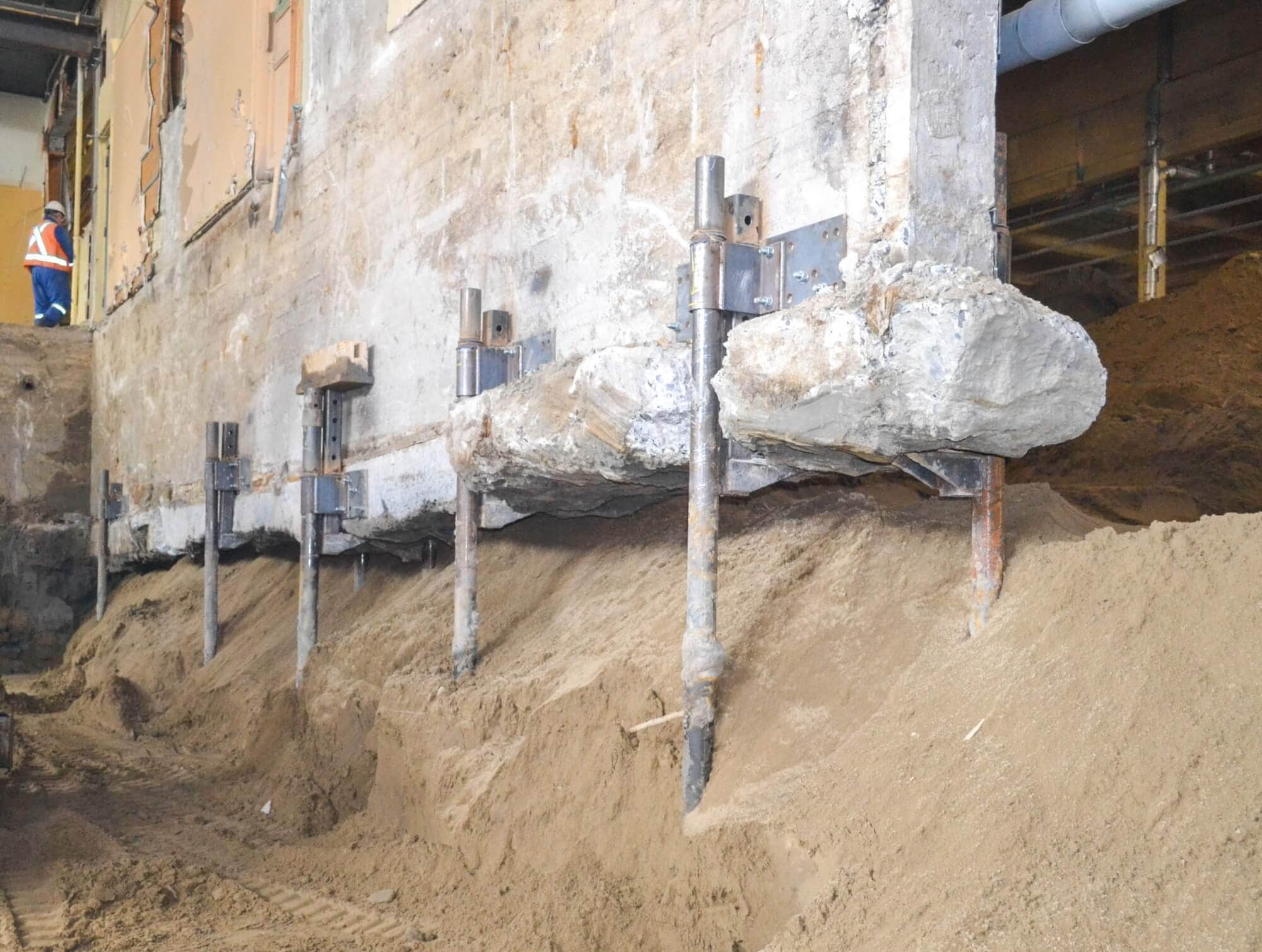 Décontamination d'un immeuble sur la rue Vincent-Massé dans la ville de Québec. L'utilisation de pieux n'a pas été difficile à prendre puisque cette solution est plus sécuritaire et plus rapide qu'une décontamination par section. 85 Techno Metal Posts supportent temporairement le bâtiment pour permettre aux excavatrices de retirer le sol contaminé avant de remplir le tout de sable compacté et de béton. Ce projet est une réalisation de Techno Metal Post Québec.