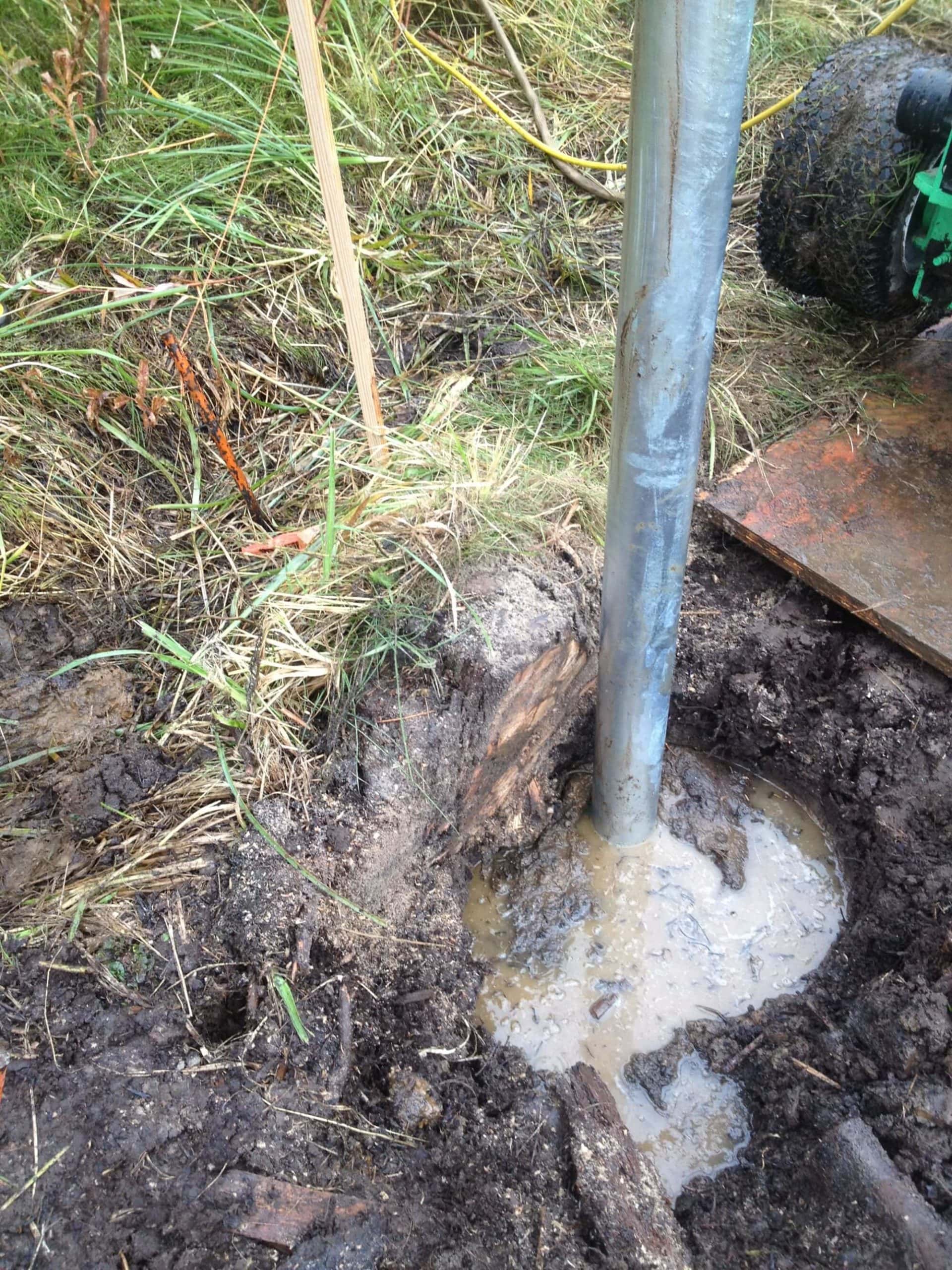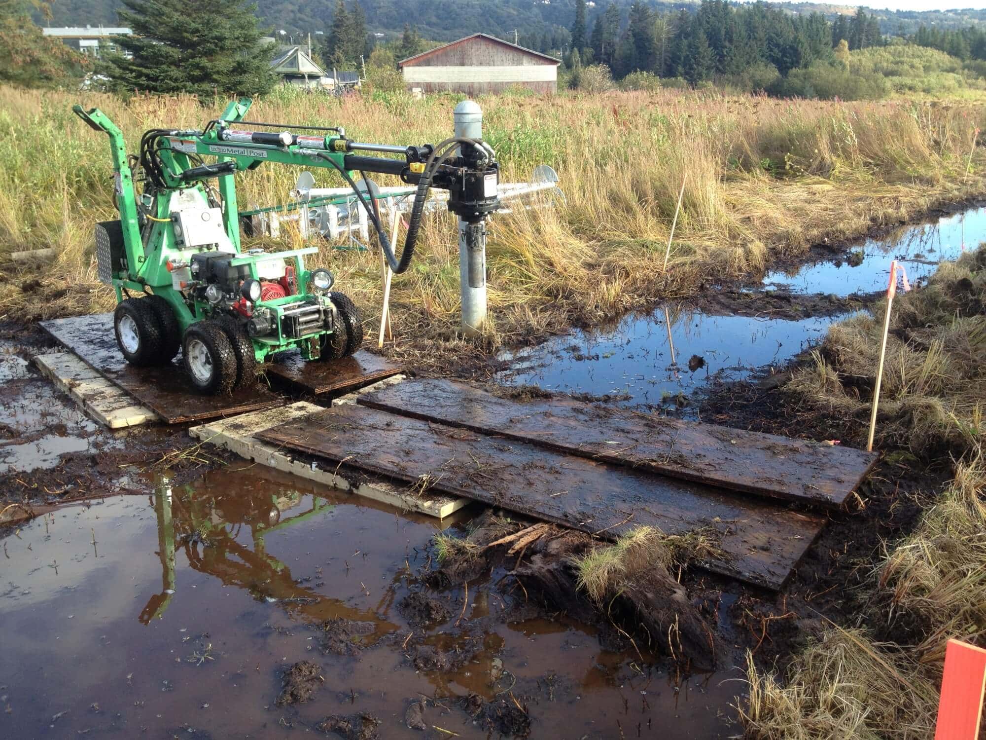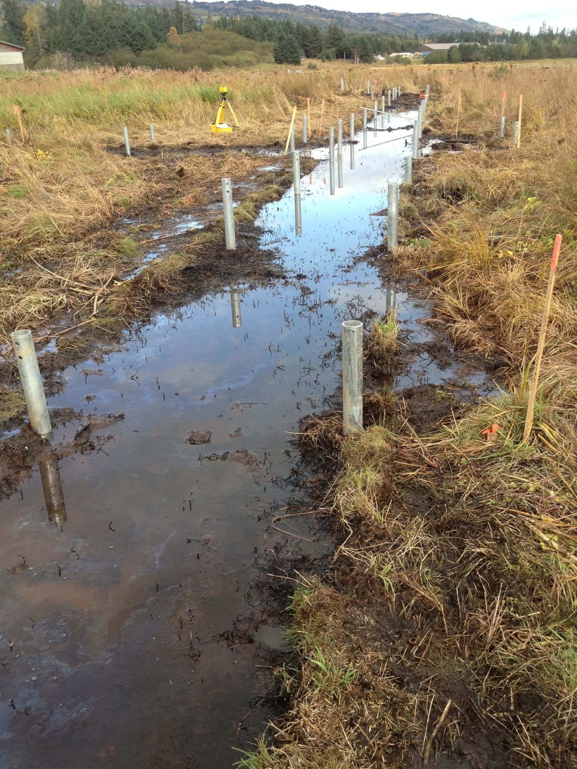 La piste fut remplie d’embûches: vieilles souches, bois flottant et même une partie d'un vieux bateau ancré dans la boue. Avec l'aide d'une tronçonneuse, nous avons été en mesure de dégager les lieux et ainsi d'y installer les 200 pieux prévus. Nous avons été en mesure d'installer un pieu, avec hélice de 16’’, près d'une souche et le déplacer sous cette dernière pour s'assurer d'atteindre avec précision l'emplacement demandé.