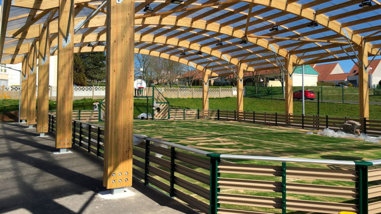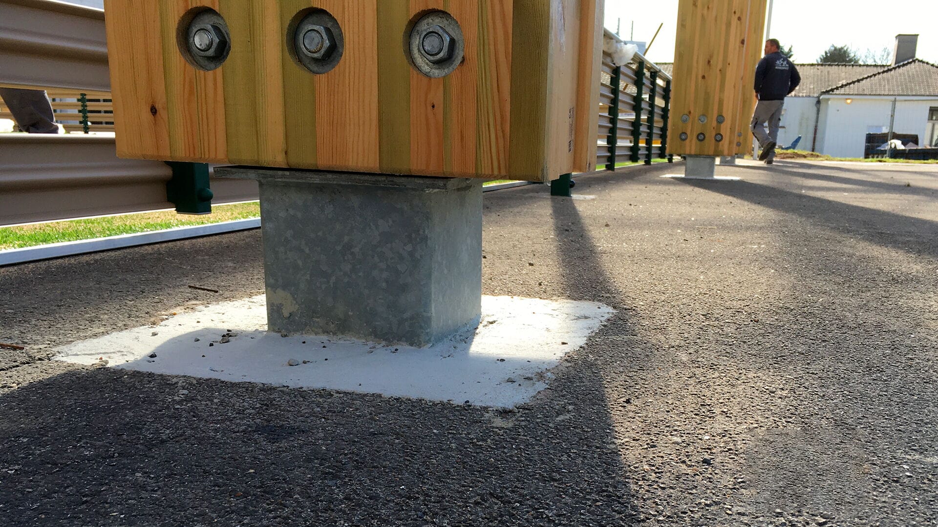 Techno Metal Post est capable de reprendre les charges de votre halle sportive point d'appui par point d'appui avec un terrassement limité ou inexistant. Point appréciable, les pieds de poteaux se fixent directement sur nos platines en têtes de Techno Metal Post sans éléments intermédiaires.