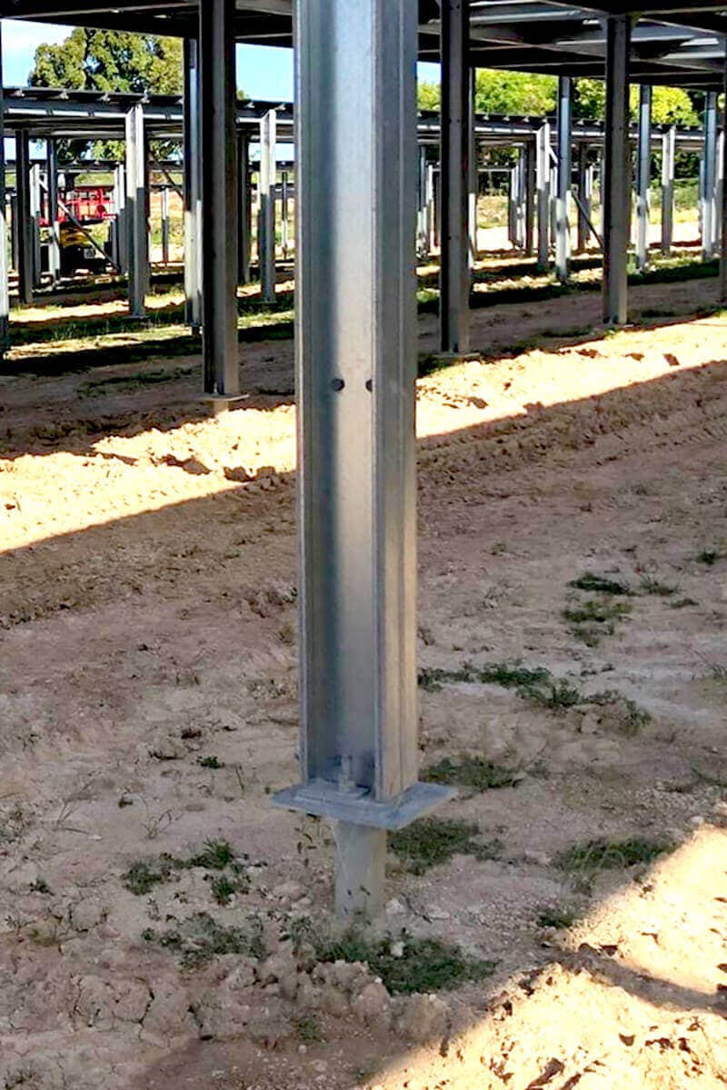 Techno Metal Post est capable de reprendre les charges de votre hangar point d'appui par point d'appui avec un terrassement limité ou inexistant. Point appréciable, les pieds de poteaux se fixent directement sur nos platines en têtes de Techno Metal Post sans éléments intermédiaires.