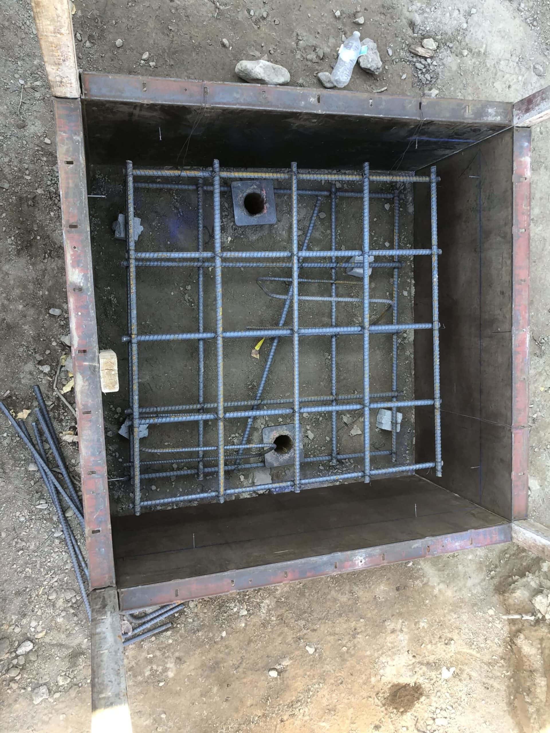 Capacité portante : Les charges requises pour chaque base de béton de ce projet variaient de 29 kips à 55 kips (129 kN à 245 kN). Chaque base de béton armé était supportée par 2, 3 ou 4 Techno Pieux afin de répondre à la charge requise comme indiqué par l'ingénieur.