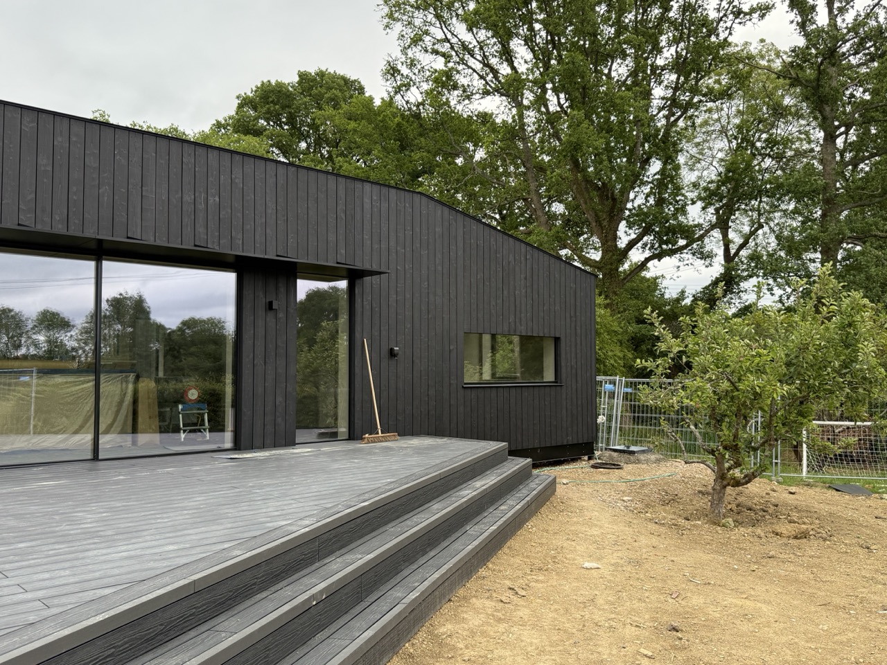 Installation de pieux vissés pour une maison modulaire ainsi que trois terrasses.