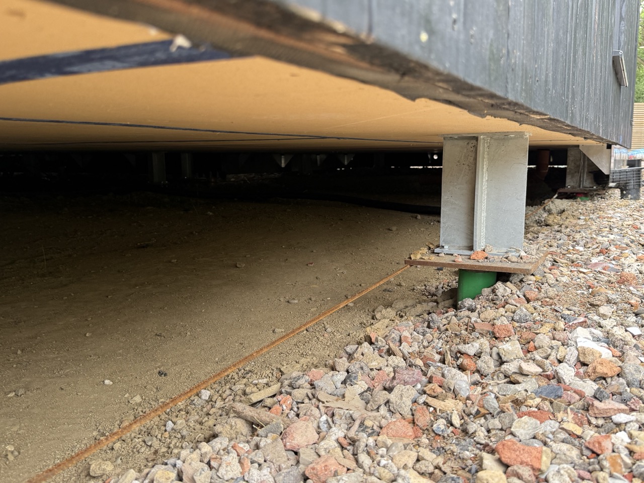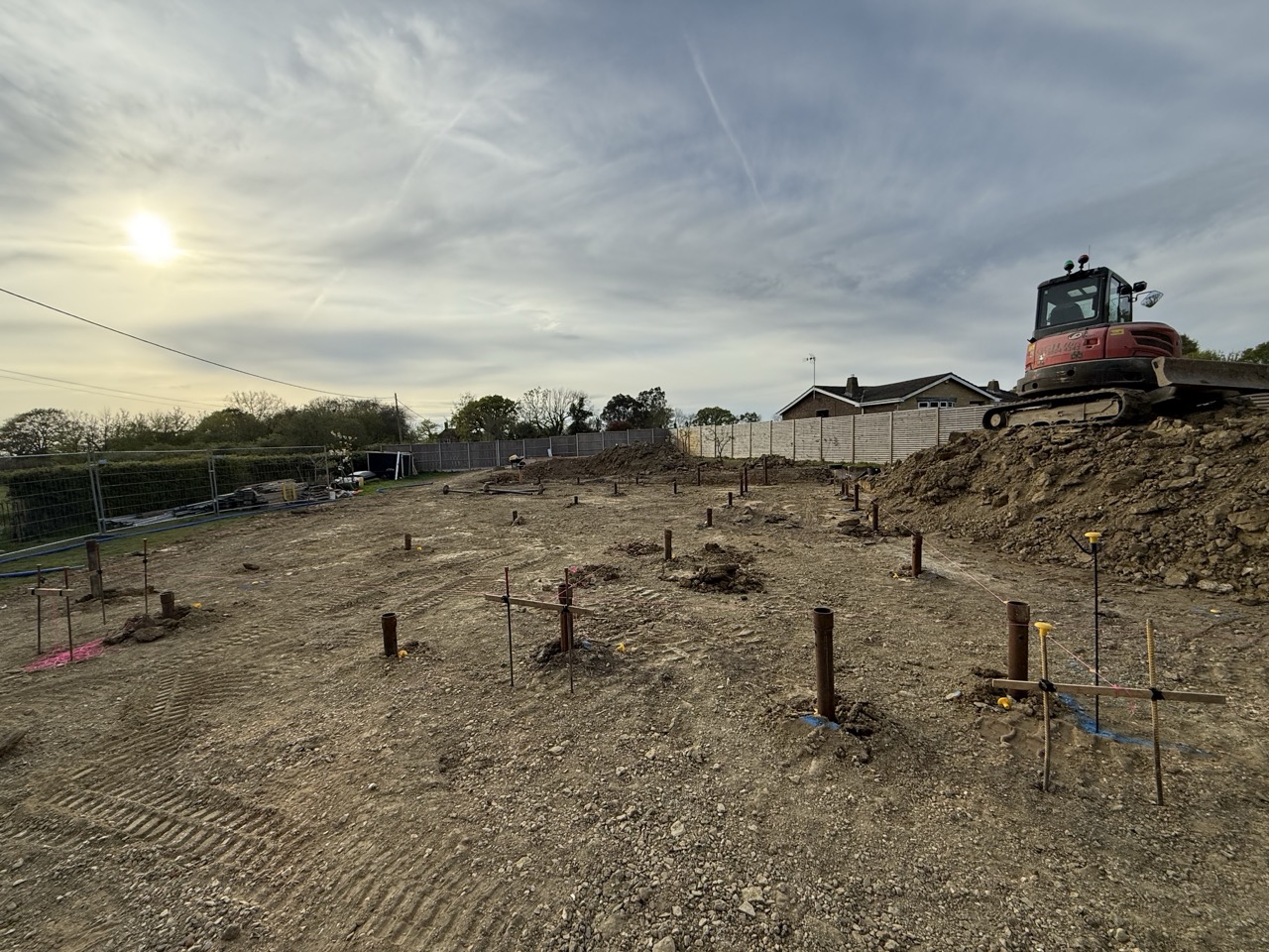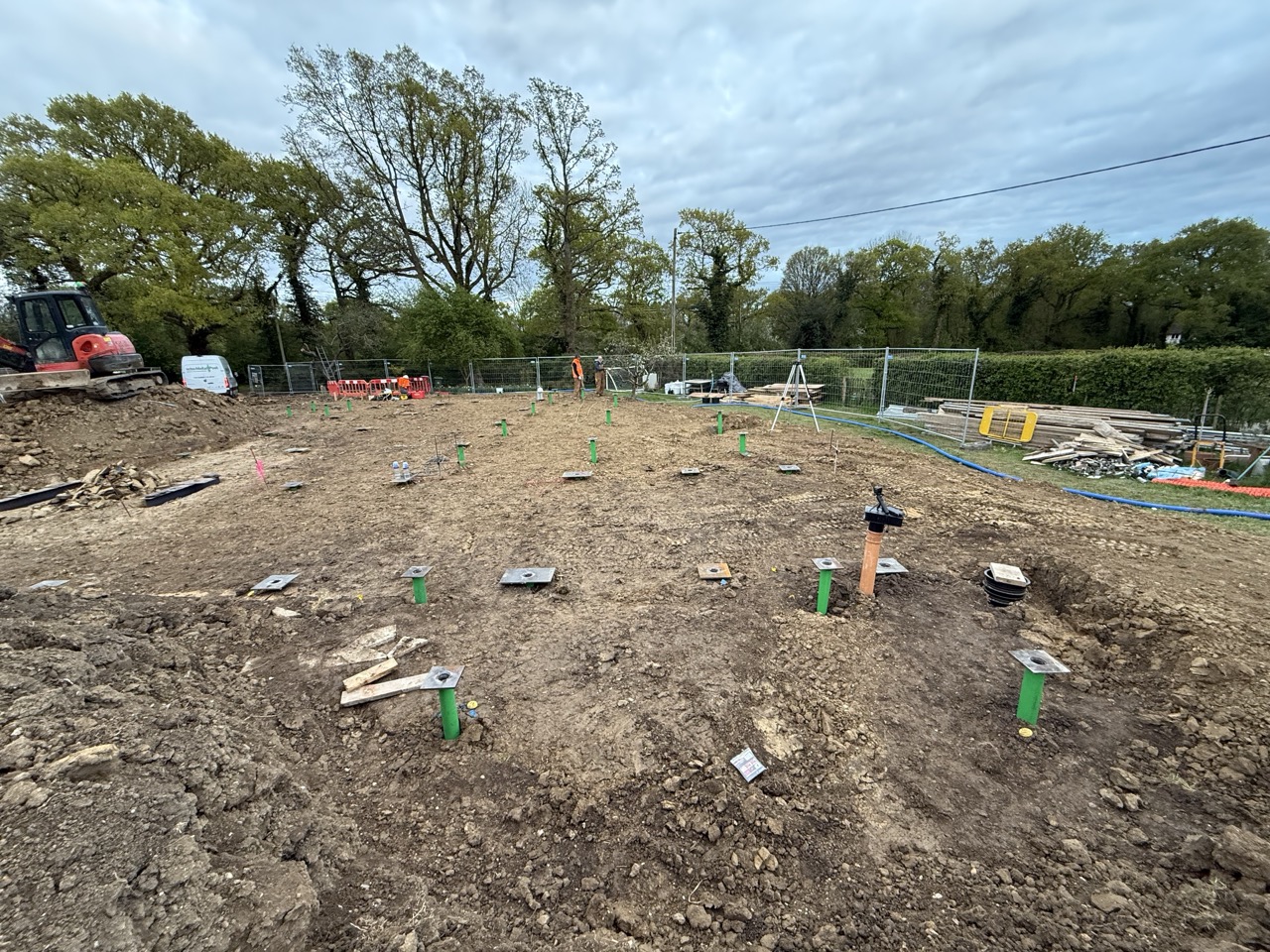 Pour répondre aux exigences du projet, 55 pieux ont été installés : 37 pieux de type P3 pour les fondations de la maison modulaire et 18 pieux de type P2.5 pour les trois terrasses extérieures. Chaque pieu a été implanté avec une grande précision, dans le respect des seuils de tolérances imposés par le système de construction modulaire en acier. Cette rigueur d’implantation a été essentielle pour garantir un alignement parfait avec les platines et assurer la stabilité de l’ensemble.